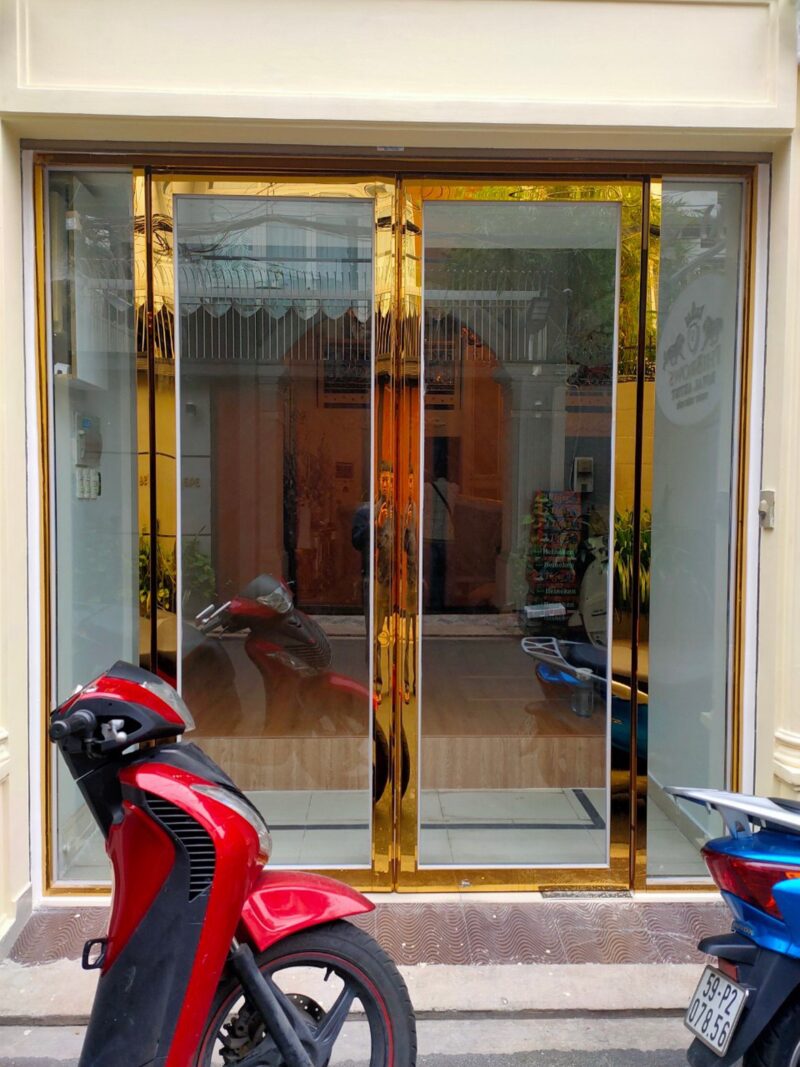 Cửa inox khung vàng PVD: sang trọng, hiện đại, phù hợp cho biệt thự và khách sạn cao cấp.