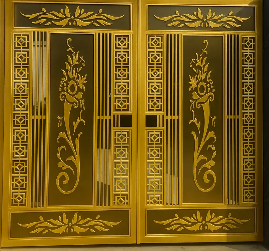 Cửa inox hoa văn CNC: Họa tiết được cắt khắc tinh xảo bằng tia laser, phù hợp cho biệt thự và nhà phố sang trọng.