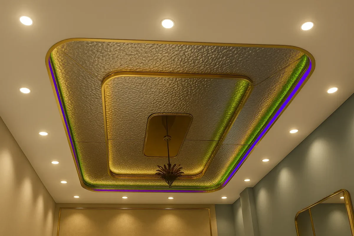 Một trong những mẫu được ưa chuộng nhất hiện nay là ốp trần nhà bằng inox màu 3D kết hợp viền vàng gương. Khi phối hợp cùng hệ thống đèn âm trần nhiều cấp, nẹp chỉ và hoa văn CNC, không gian sẽ trở nên độc đáo, hiện đại mà vẫn giữ được sự ấm cúng.